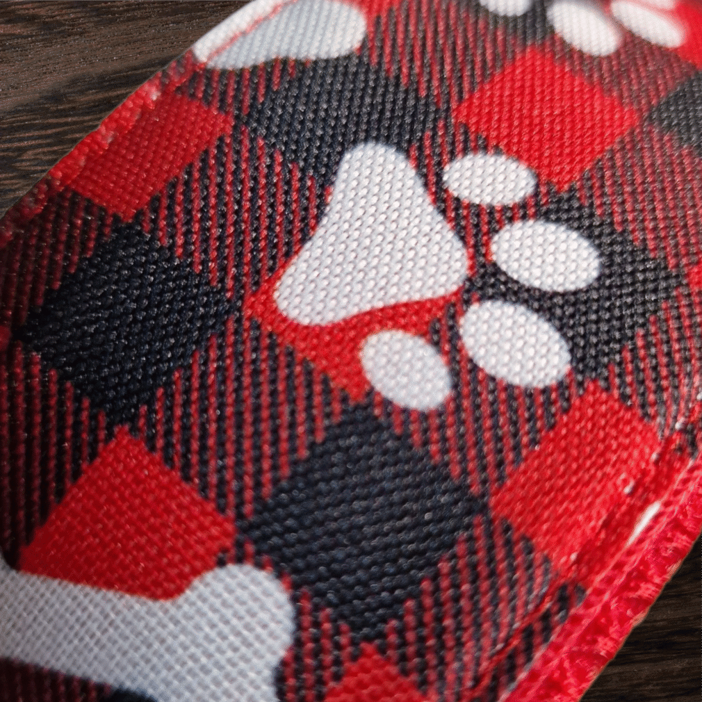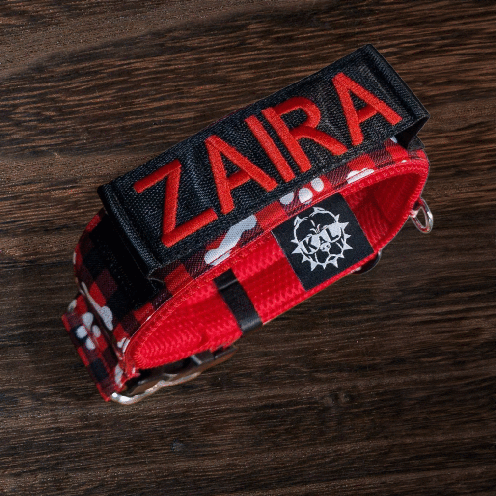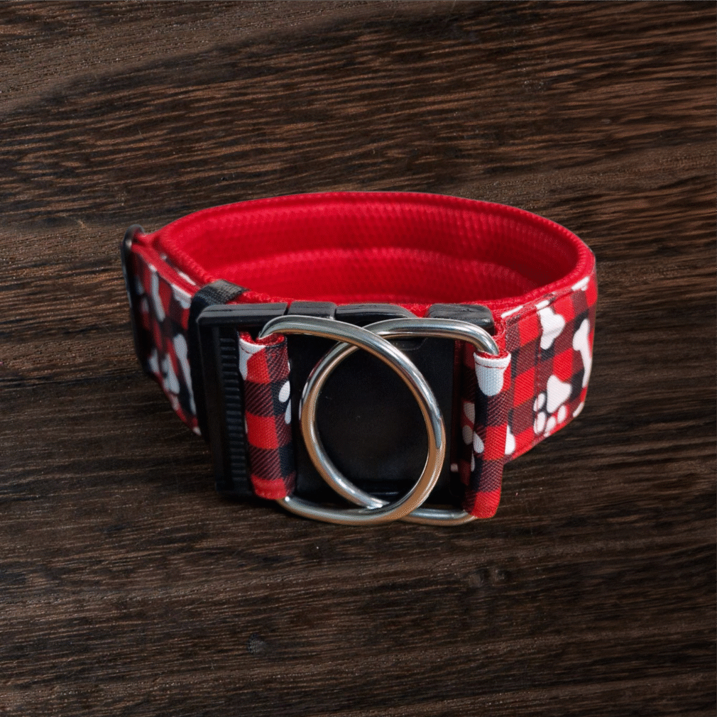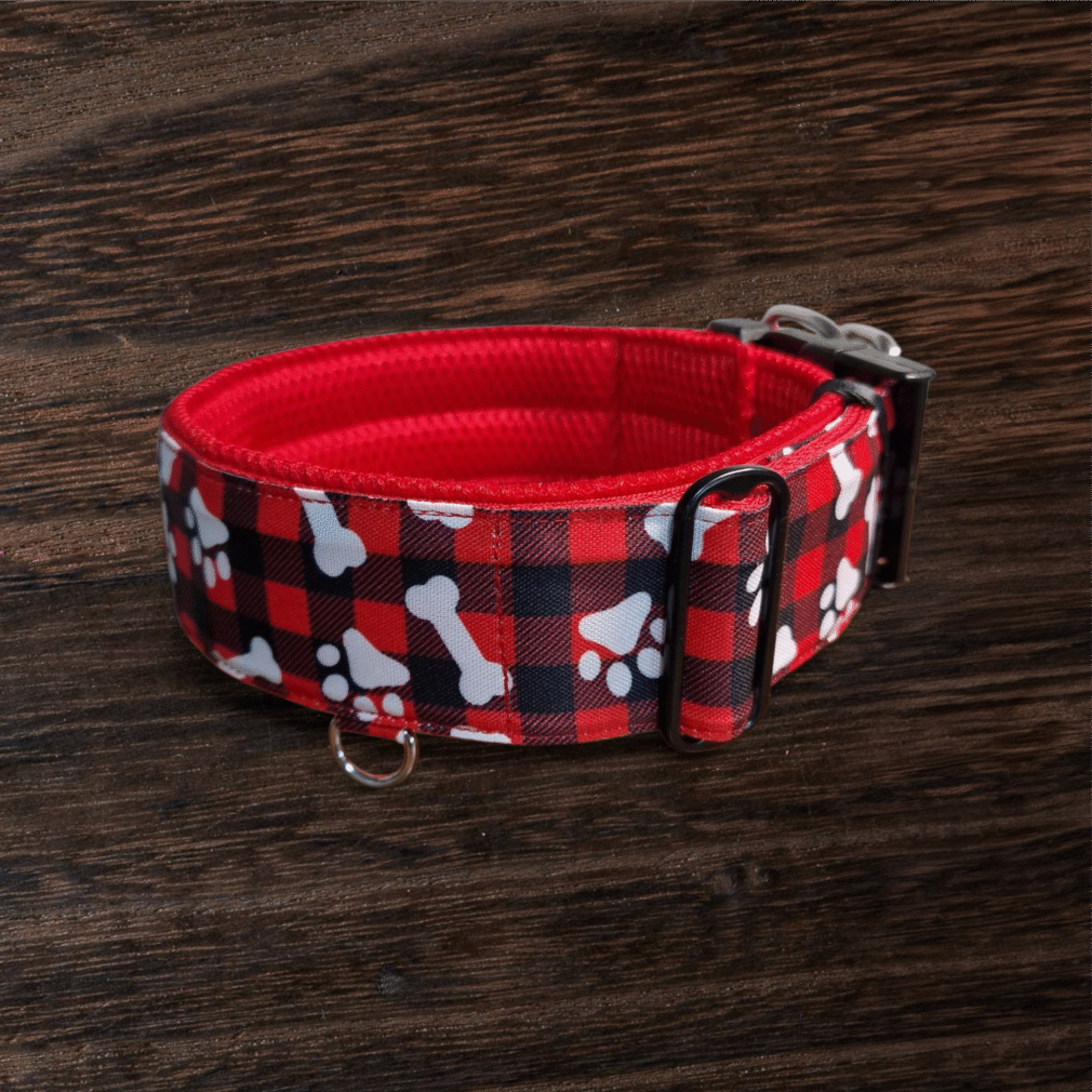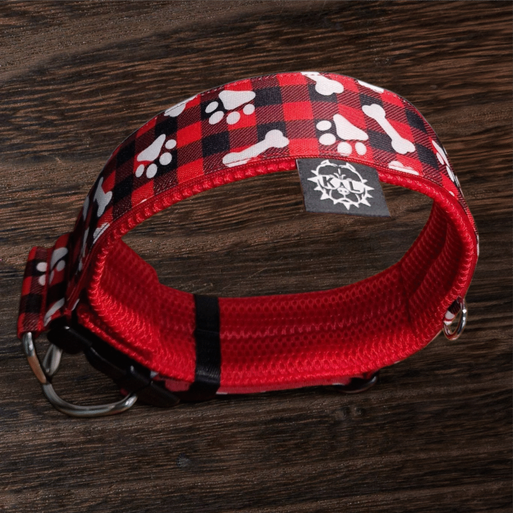 Collare KL largo 5cm tartan rosso e nero con zampette e ossa. Imbottitura morbida Rosso AirMesh per garantire massimo comfort.